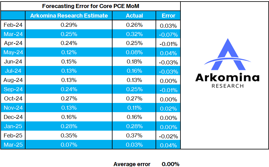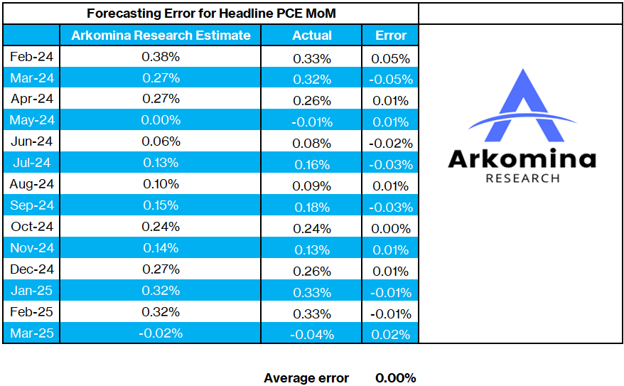 On Friday, we will get the Apr PCE inflation. Since I started publishing my PCE estimates in Feb 2024 (14 monthly forecasts so far), my average error for forecasting headline PCE has been perfect at 0 bps.